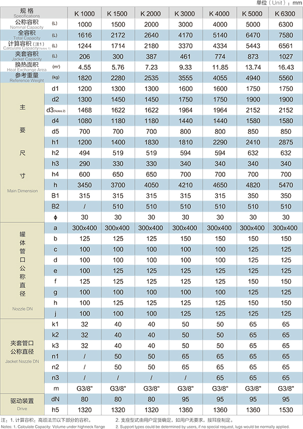 K1000L-K6300L開式搪玻璃反應(yīng)釜(開式搪瓷反應(yīng)釜)設(shè)計圖紙及參數(shù)如下所示:
