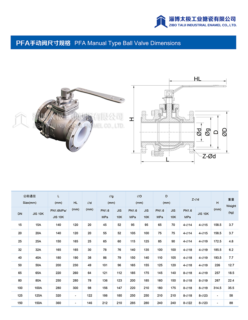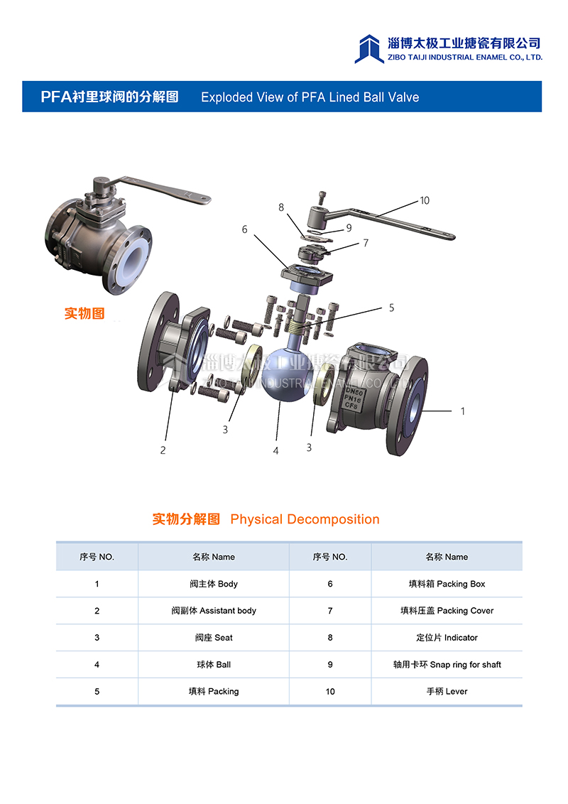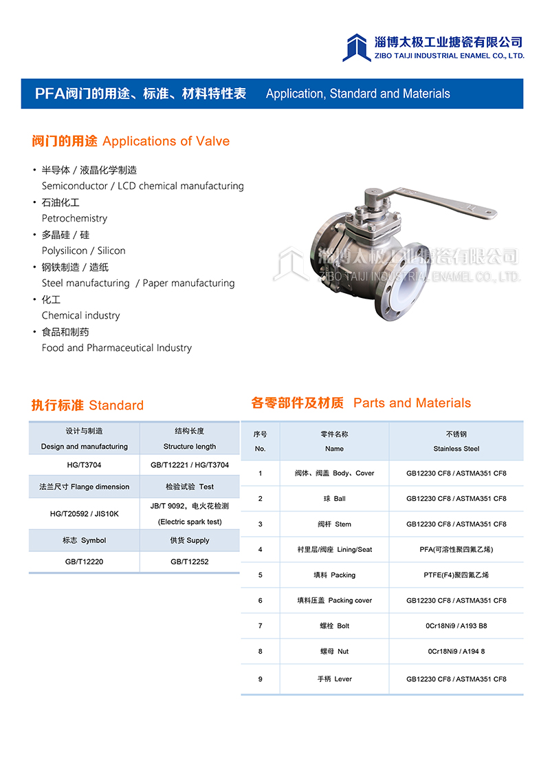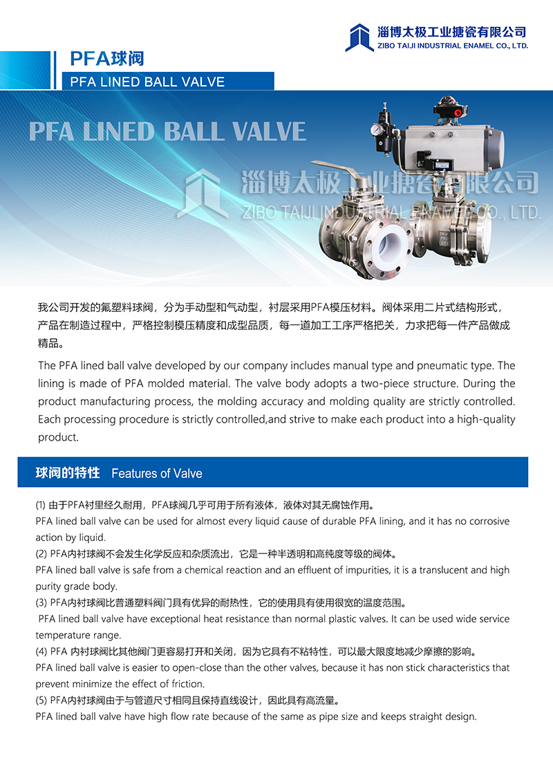 我太極公司開發的氟塑料球閥(PFA球閥),分為手動型和氣動型兩種類型,襯層采用PFA模壓材料。閥體采用二片式結構形式,產品在制造過程中,嚴格控制模壓精度和成型品質,每一道加工工序嚴格把關,力求把每一件產品做成精品。